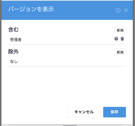 | 「含む」 | [新規] ボタンをクリックすると、許可する対象グループ・ユーザーなどを指定できます。 ゴミ箱アイコンは「含む」からの削除、時計アイコンは権限に「含む」期間設定の編集をすることができます。 |