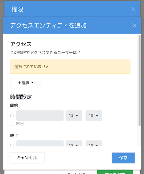 設定を内容を反映する場合は、必ず「アクセスエンティティを追加」ポップアップの [保存] ボタンと、各権限セットのポップアップの [保存] ボタンをクリックする必要があります。